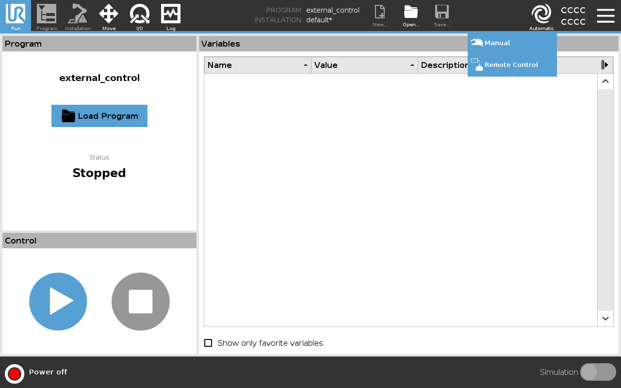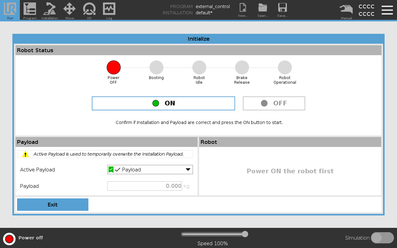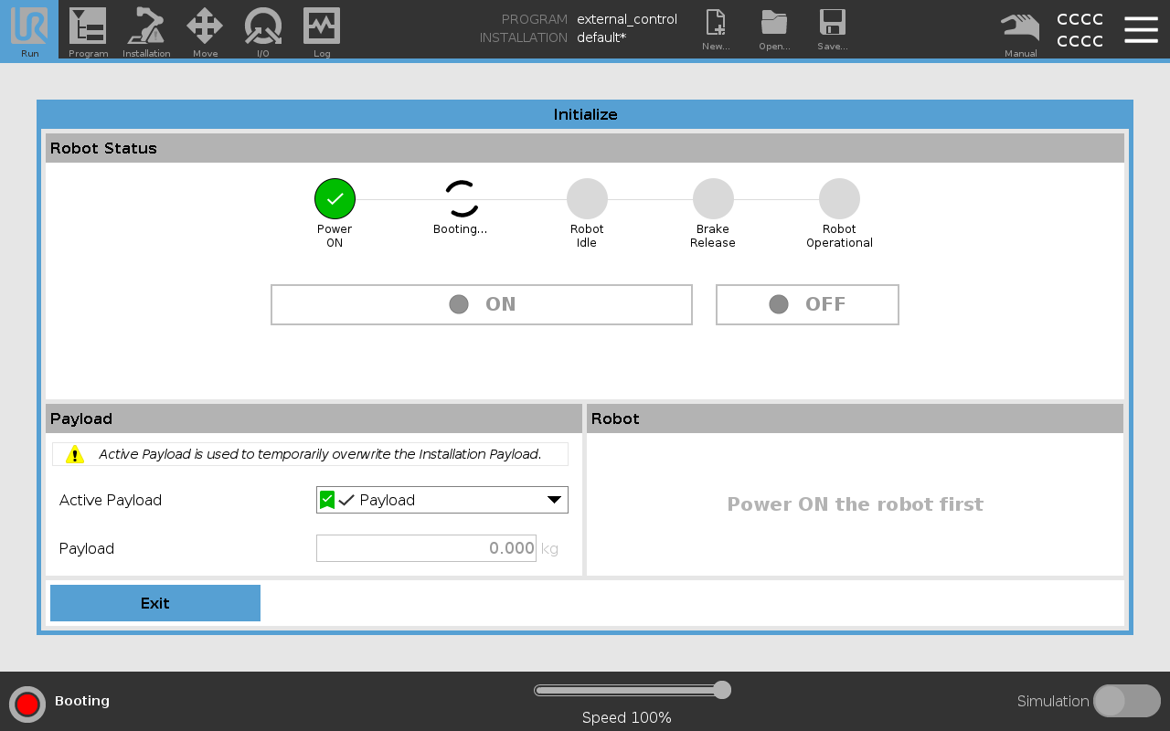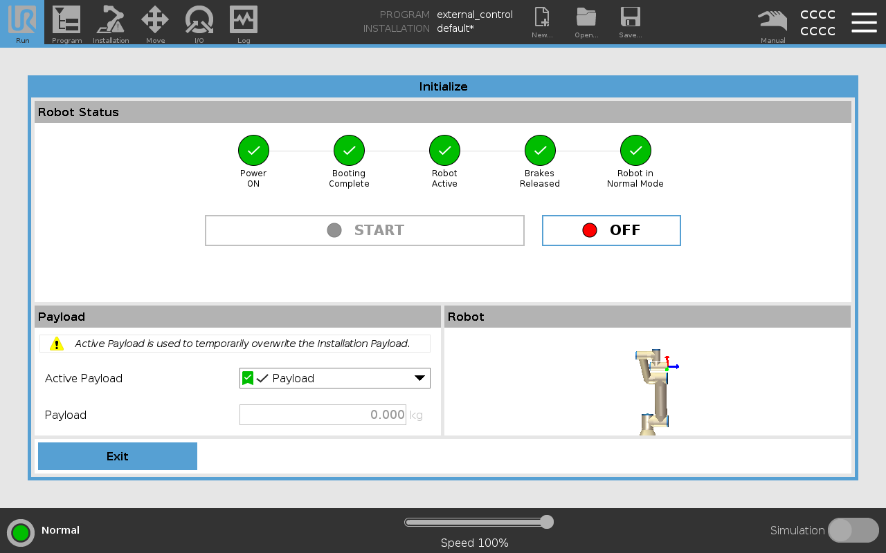 Once the robot is in normal mode, you can proceed to initialize the external control program.