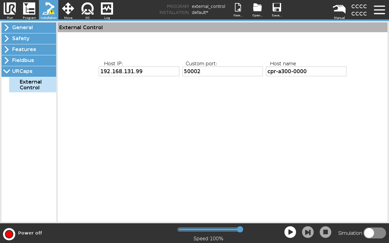 Navigate to the Installation/URCaps page to configure the IP address and hostname of the external device. The standard Clearpath robot computer IP address is 192.168.131.40. Each robot has its own hostname, we will use cpr-a300-0000 as a placeholder: