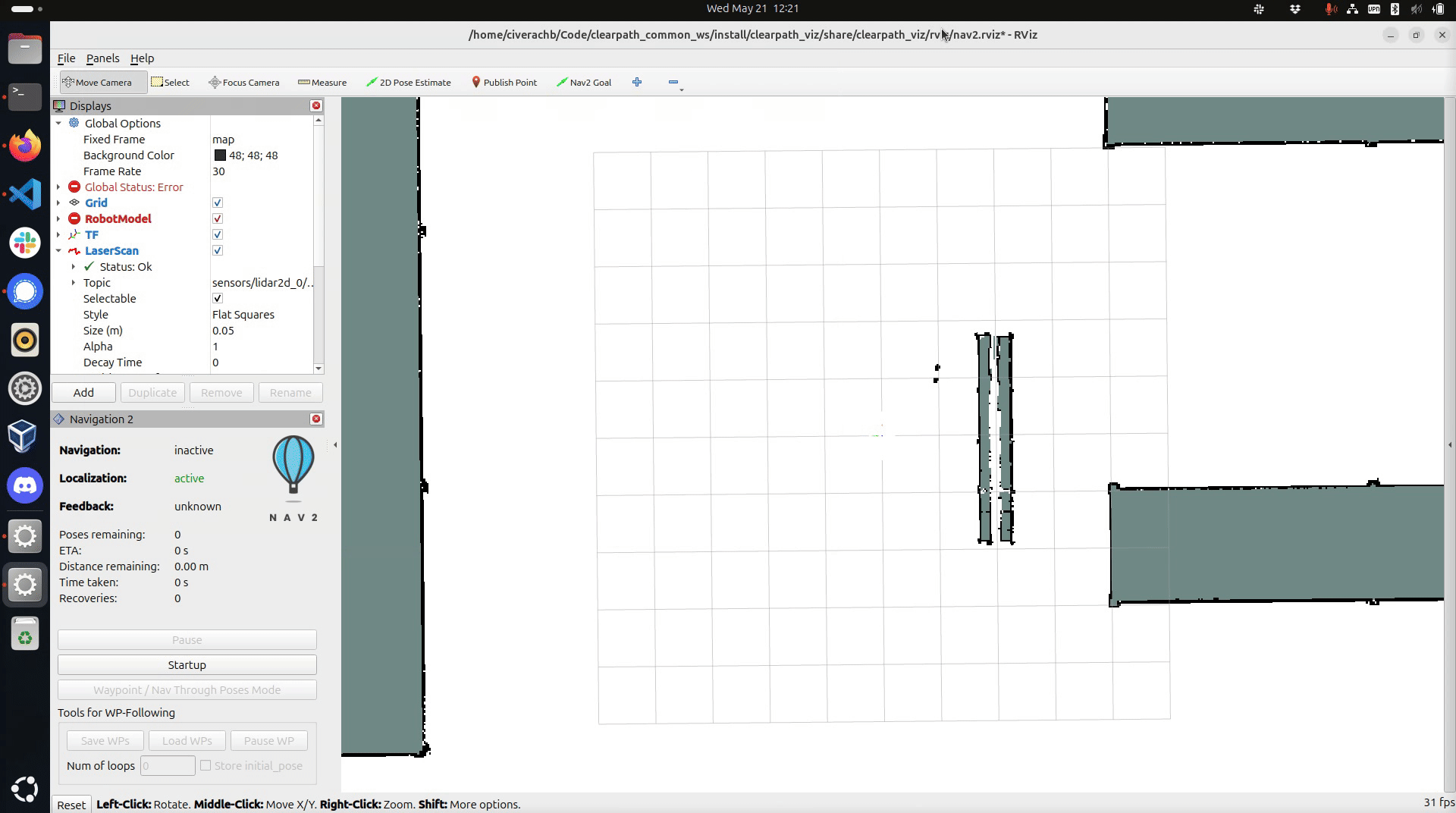 Once you have set the robot's initial pose you should see red markers representing the lidar data as well as coloured gradients indicating collision zones around walls and obstacles.