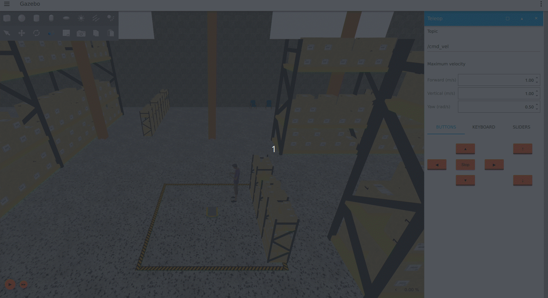 The simulated robot can be driven in the same ways as the physical robot. Take a look at the Teleop guide for details. In addition, the Gazebo Teleop GUI plugin can be used. The plugin will be visible by default when Gazebo is launched. If your robot has a namespace, change the topic to <namespace>/cmd_vel. Set the maximum forward and yaw velocities, then select the method of driving.
