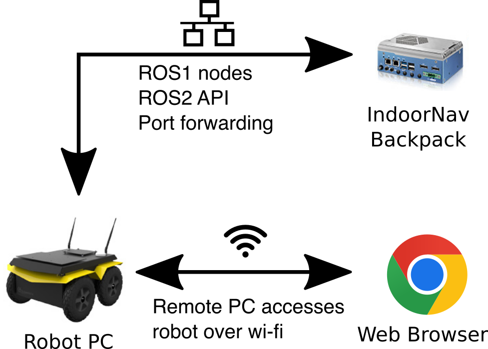 The IndoorNav backpack PC communicates over an ethernet connection with the main PC. All of the localization and path-planning is done on the backpack PC. The backpack PC does not have any direct connection to the wireless network; all traffic to/from the user's web browser is routed via the robot's main PC.