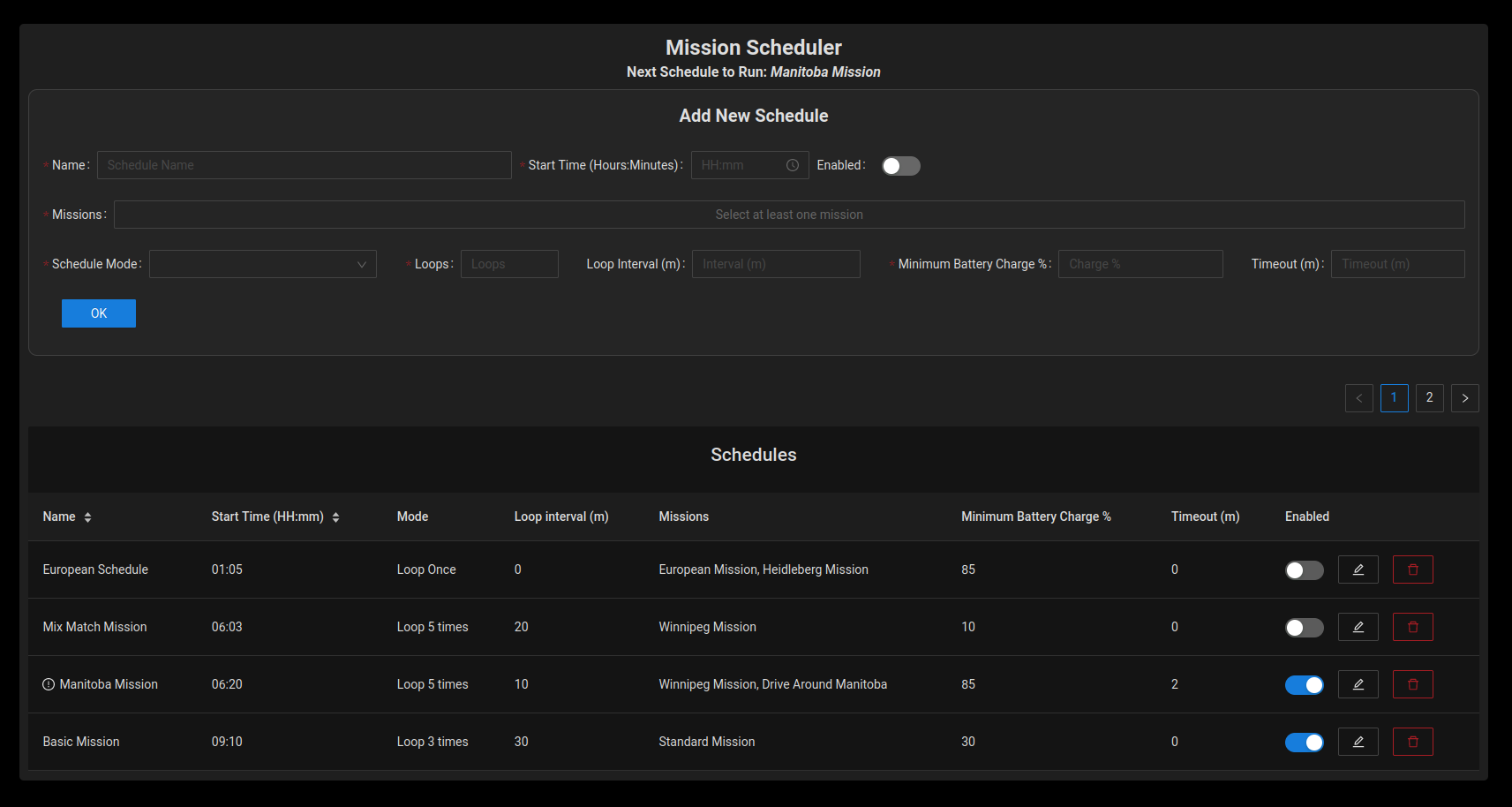 By selecting the "SCHEDULER" option from the upper left hand menu, the user can open the Mission Scheduler interface. This interface allows users to schedule groups of missions to run at a later time. These schedules can be set to run only once or to be looped over a period of time. For example, a user could create a schedule that will run 3 missions starting at 9 AM and run every hour 8 times. Once the last iteration is run, the schedule will disable itself and can be re-enabled to run again later. The view itself can be found in the image below and is elaborated further afterwards.
