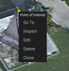 If a POI is assigned one of the two predefined tags, goto and/or inspect, the user will have the ability to perform some quick actions when they right click the POI. If the POI has a goto tag, the user will see a Go To option in the right click options that will autonomously navigate the UGV to the location of the POI (if it is within the bounds of the current network). If the POI has an inspect tag, the user will see an Inspect option in the right click options that will move the PTZ camera to view the POI when clicked. See the below image for an example of a POI that has both the goto and inspect tags, and therefore has the Go To and Inspect action options when right clicked.