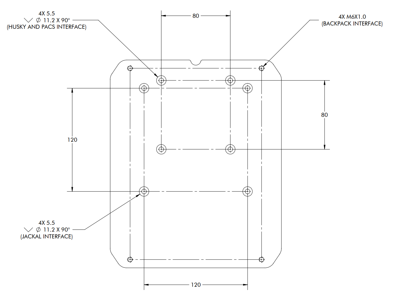The OutdoorNav Starter Kit can be mounted directly using either its 80 X 80 mm or 120 X 120 mm hole pattern as shown in the following image.