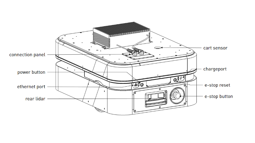 Below is an overview of the Boxer robot hardware that outlines the key components that you should be aware of in order to get started with using your robot. Note that the front emergency stop button is only present on Boxer V2.5.