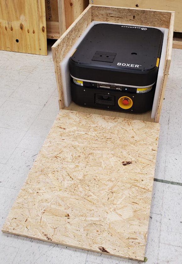Boxer ships fully assembled and no assembly is required. To unbox, remove the screws holding the top wood panel and the front wood panel. Remove the screws holding the cross bracing. An electric driver should be used to aid in the removal of the screws. Lay the top wood panel down with one end on the edge of the crate and the other end on the ground to create a ramp as shown below. Pull the robot out of the crate by hand, and then roll the robot down the wood ramp.