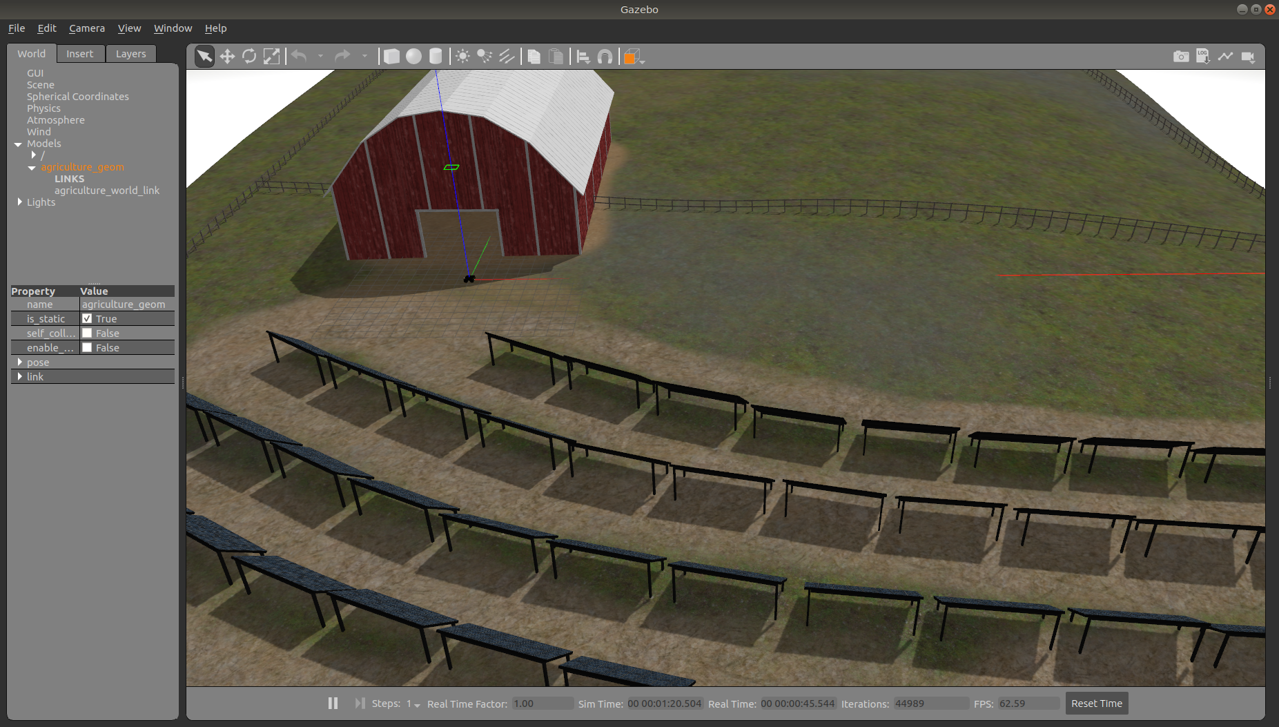 Agriculture World is a flat, mixed indoor/outdoor world that include a large barn, open fields surrounded by fences, and a large solar farm. It is intended to simulate missions such as solar panel inspection and area coverage.