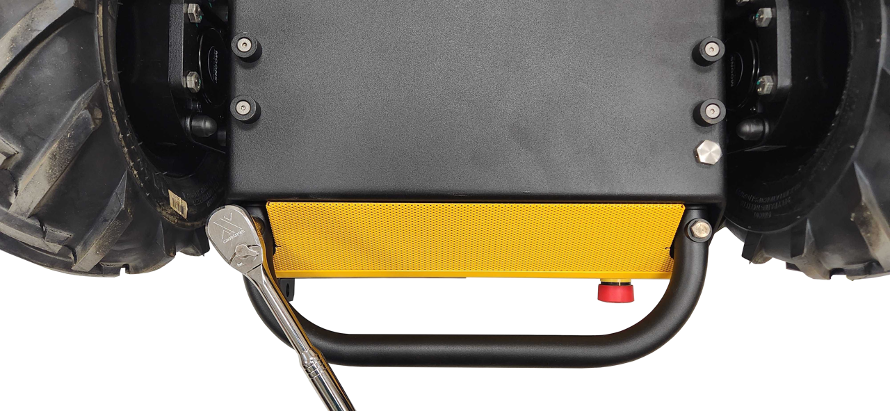 Always use chock blocks on the wheels when powering off the robot. Husky A300 can roll on slopes when the robot is unpowered.