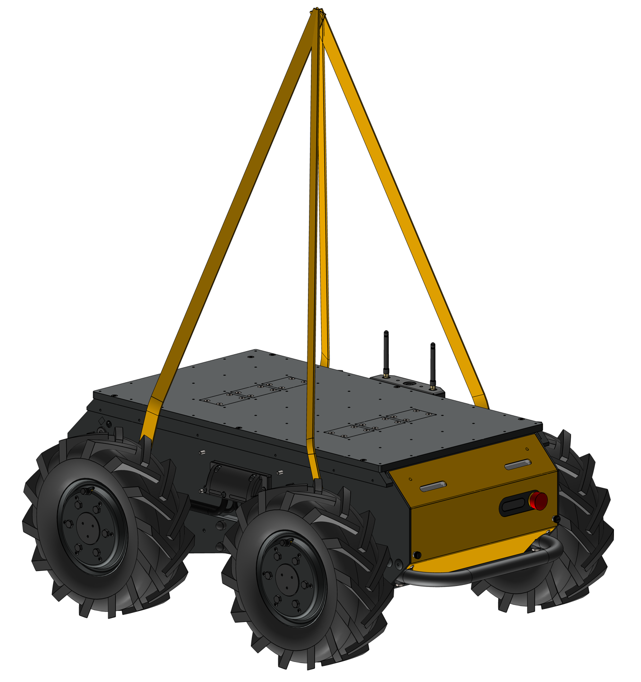Always follow the safe lifting procedure for Husky A300 as detailed in this manual. The robot may be lifted by 2 people at the 2 bumpers, or with lifting slings under the robot.