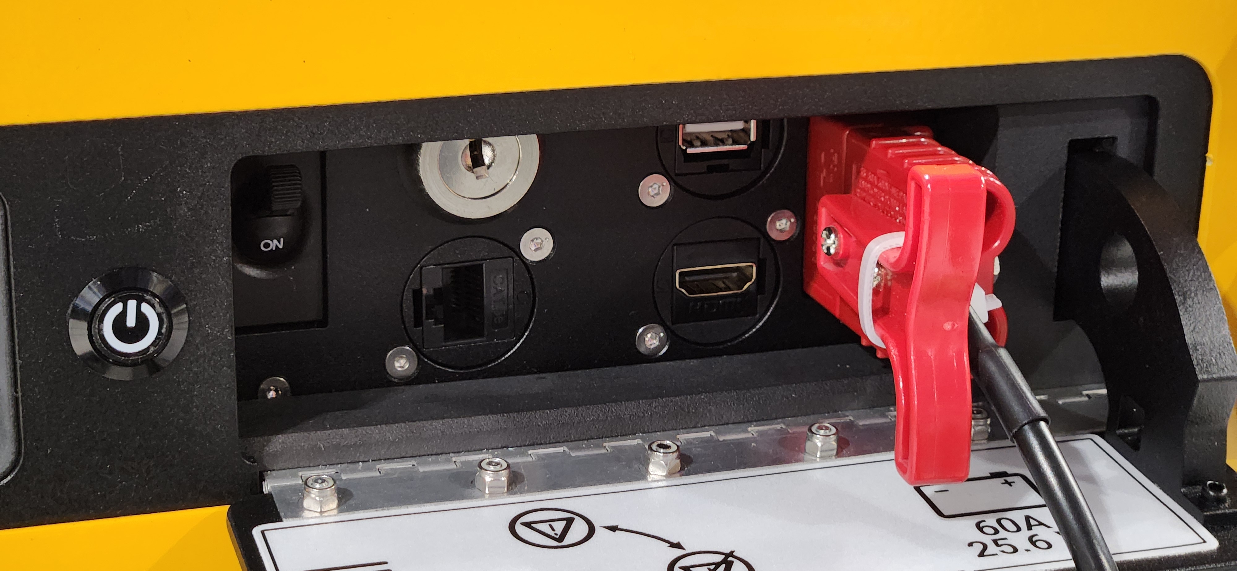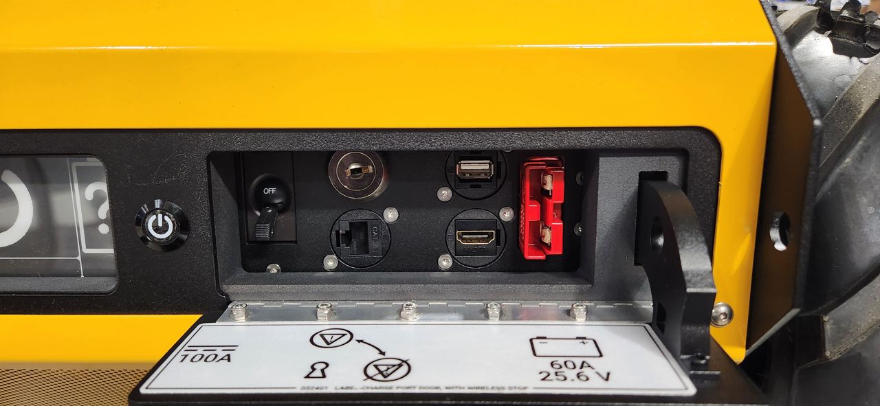 The robot's manual charge connector is visible behind the Rear Charge Port Door. This connector has live battery voltage when the circuit breaker is in the On position.